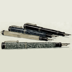 Matching pencils would come with either clip or ring, depending on the pen selected. The pen was available only in black and red hard rubber until 1926, when Parker introduced the “unbreakable Permanite” Duofold (Permanite was Parker’s trade name for a plastic manufactured by DuPont). The first new hue was the now traditional red, followed by Jade green (made to compete with Sheaffer's revolutionary Jade Radite Lifetime pens) which was not originally referred to as a Duofold, but rather the Black Tipped Jade (changed shortly thereafter). This was followed by Lapis Lazuli blue and Mandarin Yellow. In 1928, Moderne black and pearl (black lined pearl) was introduced as a Deluxe model and Parker signified this by the addition of a third cap ring to the cap band instead of the usual two found at the time. In 1930 the Duofold line was streamlined with tapered ends replacing the familiar “flat-top” style. Additional varieties were introduced: burgundy (red and black pearl); Moderne green and pearl (green lined pearl); and finally, green and black pearl (black lined green pearl).